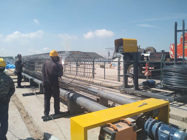 3、機(jī)器上骨架制作過程;備齊一節(jié)鋼筋籠所需箍筋按位置平放兩輥輪上,將一根主筋抬放于輥輪長度上方,調(diào)整好起始尺寸,豎直箍筋,主筋靠著箍筋單面施焊,待主筋轉(zhuǎn)至上方再補(bǔ)焊。焊完一節(jié)主、箍筋,低速轉(zhuǎn)動(dòng)膠輥,抬二根主筋準(zhǔn)備焊接。此時(shí)按選定生產(chǎn)工藝確定旋轉(zhuǎn)方向,采用卡具(比子)制作骨架時(shí),待二根主筋或多根主筋焊完后,主筋下行。若采用掛鉤工藝則反向旋轉(zhuǎn),應(yīng)注意多根主筋焊好后有可能出現(xiàn)偏重,可將骨架旋轉(zhuǎn)在對(duì)面位置或錯(cuò)開幾根位置后再開始分度焊接,后補(bǔ)齊焊完全部主筋。